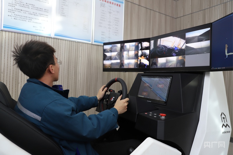 东露天矿技术人员正在操作卡车应急接管平台(央广网记者 张晋鹏 摄)