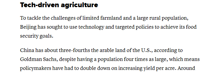 美国消费者新闻与商业频道援引高盛集团的数据报道称,中国拥有的耕地面积约为美国的四分之三,但人口是美国的四倍之多,这意味着中国的政策制定者必须加倍努力提高每亩土地的产量。