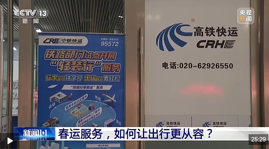 中铁快运股份有限公司高铁快运部副部长 俞晖:目前“轻装行”的服务,日均订单量大概在100单左右,相较于春运之前已经增加了70多单,运输的需求量还是非常大的。目前大部分需求是出发的旅客,主要是需要从酒店或者是家里帮旅客把行李搬运到出发乘车的火车站。现在像北京南站、北京西站、上海虹桥站、广州南站这些车站都是春运客流比较集中的车站。