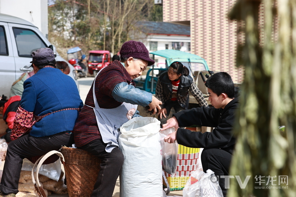 车辆停稳,拉开车门,还没来得及打招呼,姑婆们便围了上来:“前两天喊你来吃杀猪饭怎么没来诶”“今年过年还来我屋里过年不”“好久没看到你,我是想你得很诶”……她们的身边,是早已准备好的土货,自产的红薯干、渣海椒、黄豆、花椒、豆豉等农产品装在编织袋或塑料桶里,散发着诱人的香气。