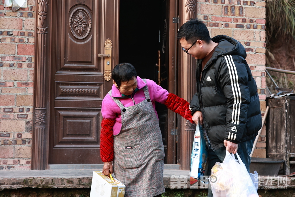离开之前,王均勇还有件重要的事要办。他拎着礼盒,带着我们一起,前往黄淦村给77岁的姑婆王国学送年货。