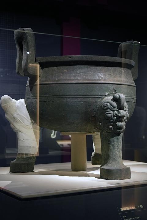 一件青铜镬鼎的鼎足缠着“绷带”展出。视觉中国供图