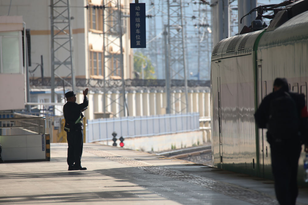 ↑ 2月16日,在昆明站,中铁昆明局集团的职工进行发车前的例行检查。新华社发(李云生摄)