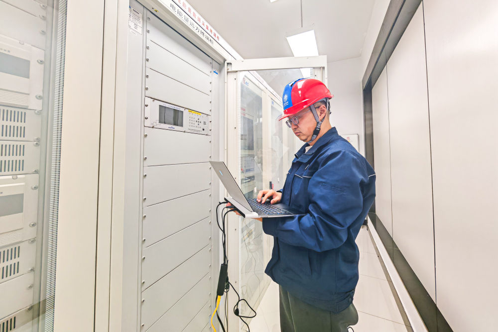 ↑ 2月16日,国网湖北超高压公司工作人员在宜昌500千伏安福变电站对设备进行巡检。新华社记者 肖艺九 摄