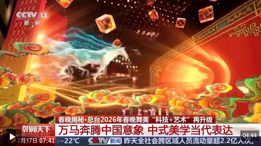 中央广播电视总台马年春晚在文化滋养与科技赋能下,呈现活力满满、蒸蒸日上的新时代奋进气象。今年总台春晚舞美设计,运用了哪些科技手段,从中华优秀传统文化中汲取哪些创意灵感,又有哪些开创性创新呢?