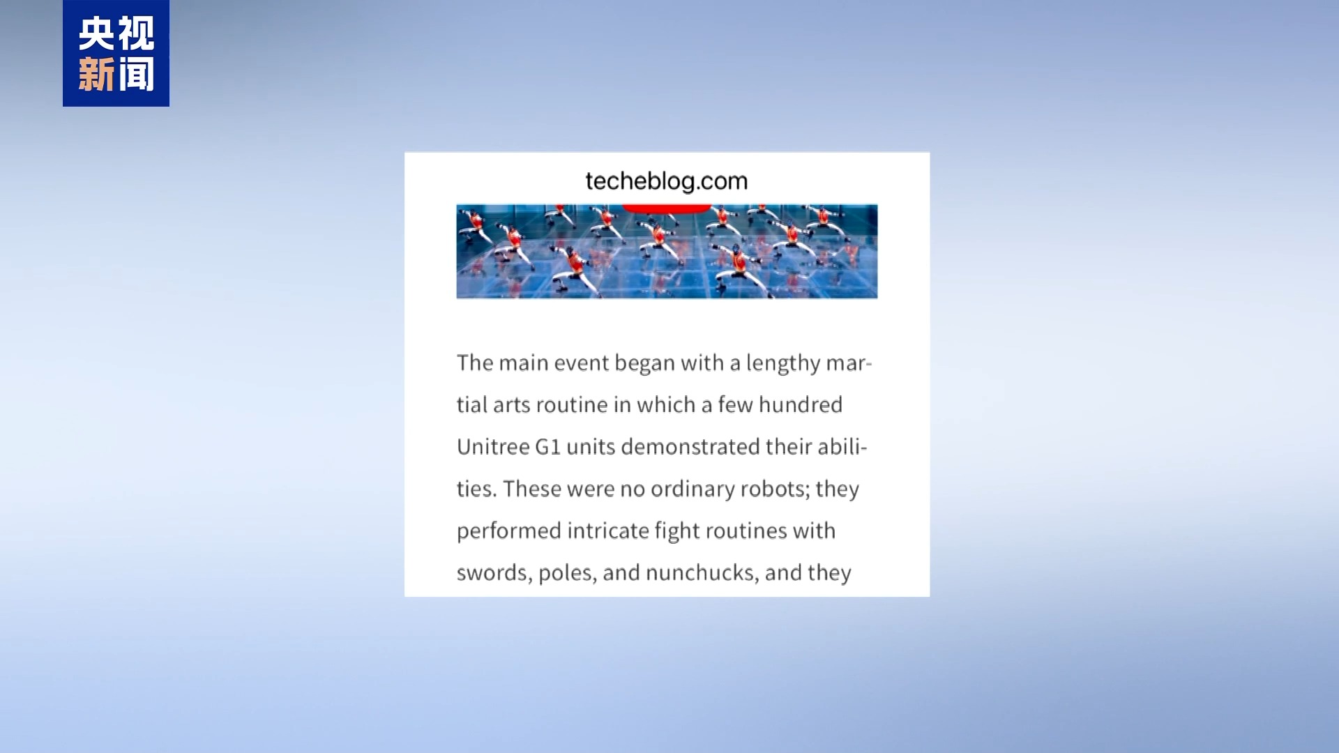 有美国科技媒体(mikekalil)发表题为《中国仿人型机器人在春节联欢晚会上大放异彩》的文章,文中称“机器人的动作比去年的机器人表演更加杂技化和更具流畅性。它们表演了空中技巧、跑酷,以及标志性的武术招数,展示了全身协调和精确的时间控制。”