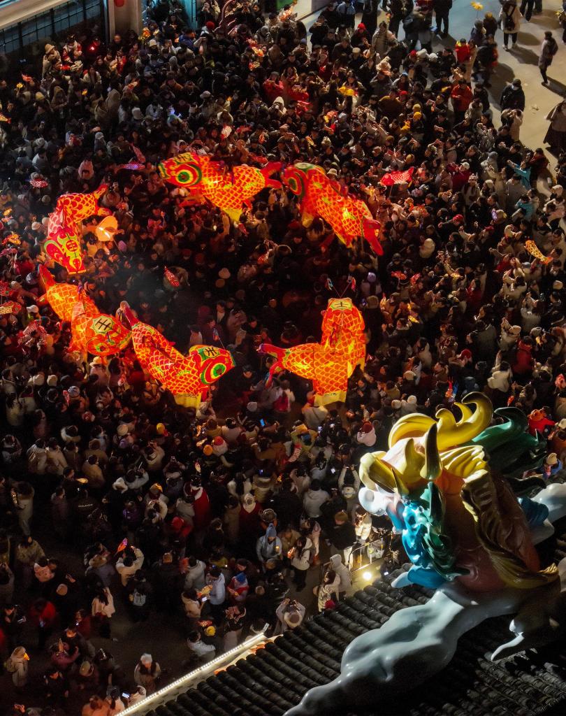2月7日,瞻淇村鱼灯队在村中表演(无人机照片)。
