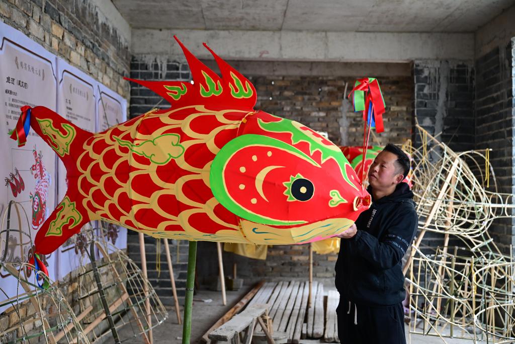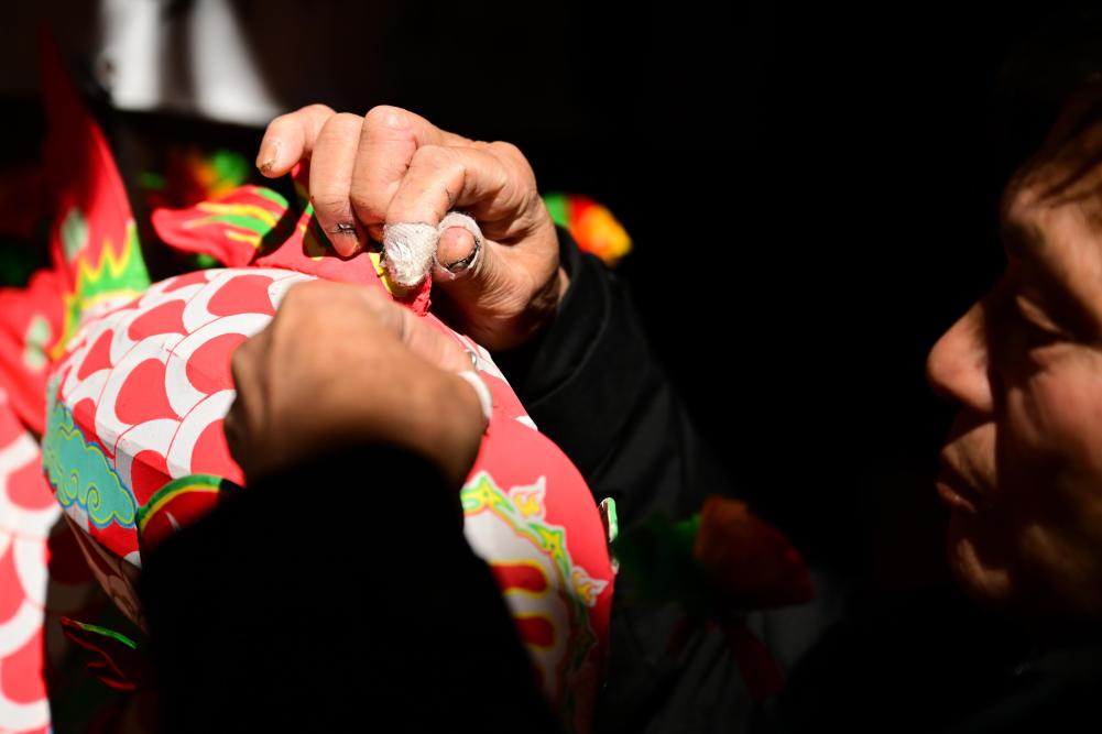 1月29日,瞻淇村的县级非遗项目瞻淇鱼灯代表性传承人汪卓荤在制作鱼灯。