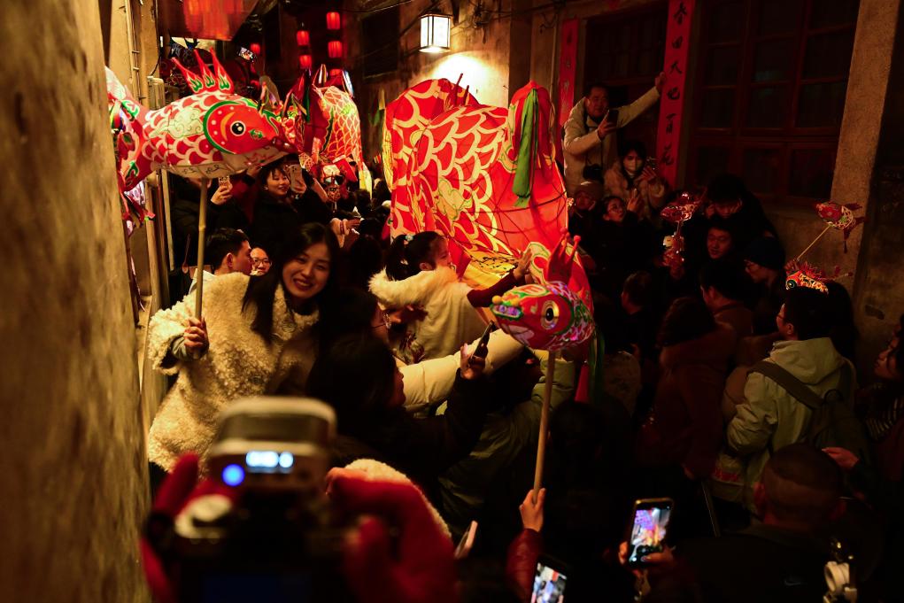 2月7日,游客在瞻淇村里体验鱼灯表演。