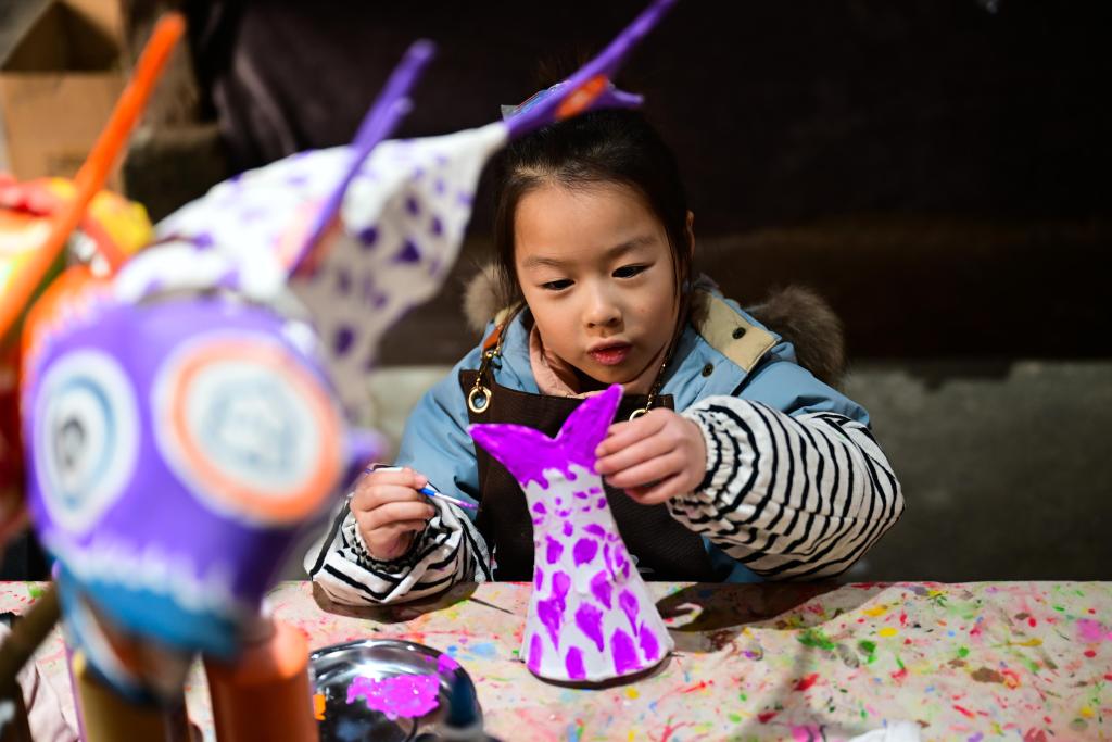 2月8日,小朋友在瞻淇村里体验鱼灯制作。
