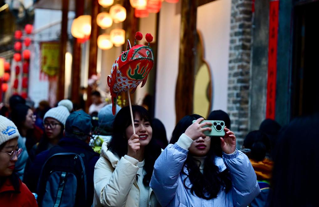 2月7日,游客在瞻淇村和鱼灯合影。