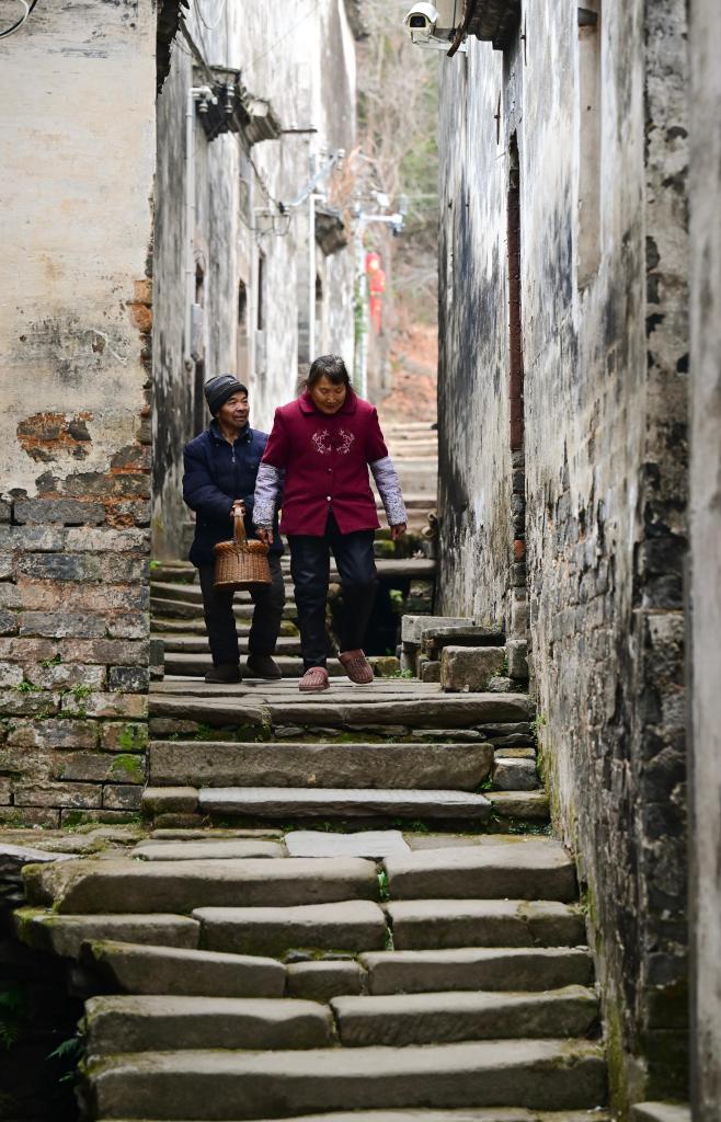 2月8日,村民在瞻淇村晒太阳。