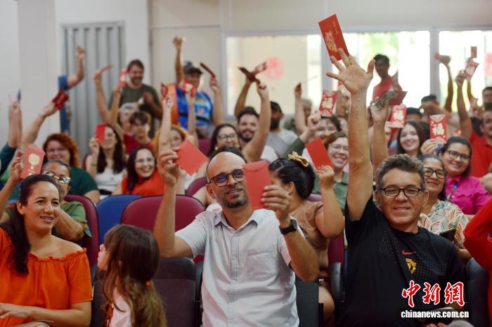 2026年中国农历新年适逢巴西狂欢节。当地时间2月16日,在巴西东北部北里奥格兰德州阿波迪小镇,巴西农户、农业专家和中国农业大学师生们在阿波迪科技小院里联欢,欢乐地展示“红包”。中新社记者 林春茵 摄
