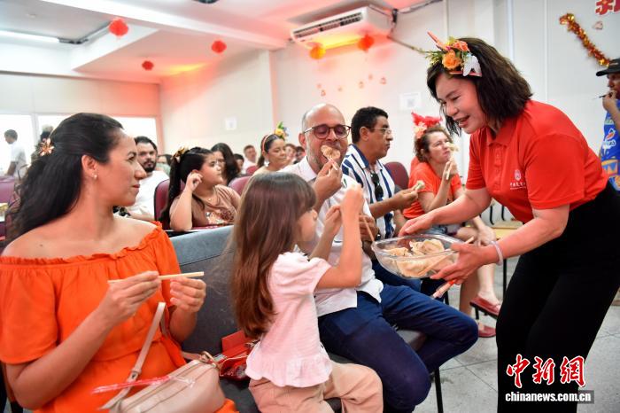 2026年中国农历新年适逢巴西狂欢节。当地时间2月16日,在巴西东北部北里奥格兰德州阿波迪小镇,巴西农户、农业专家和中国农业大学师生们在阿波迪科技小院里联欢。图为小院首席专家、中国农业大学工学院教授杨敏丽(右一)请巴西嘉宾品尝饺子。中新社记者 林春茵 摄