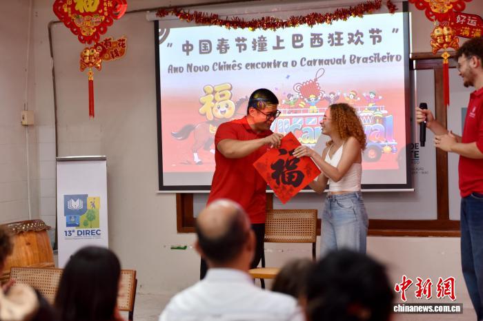 2026年中国农历新年适逢巴西狂欢节。当地时间2月16日,在巴西东北部北里奥格兰德州阿波迪小镇,巴西农户、农业专家和中国农业大学师生们在阿波迪科技小院里联欢。驻点阿波迪科技小院的中国农业大学博士后倪昕东(左)送给阿波迪市民一幅“福”字。中新社记者 林春茵 摄