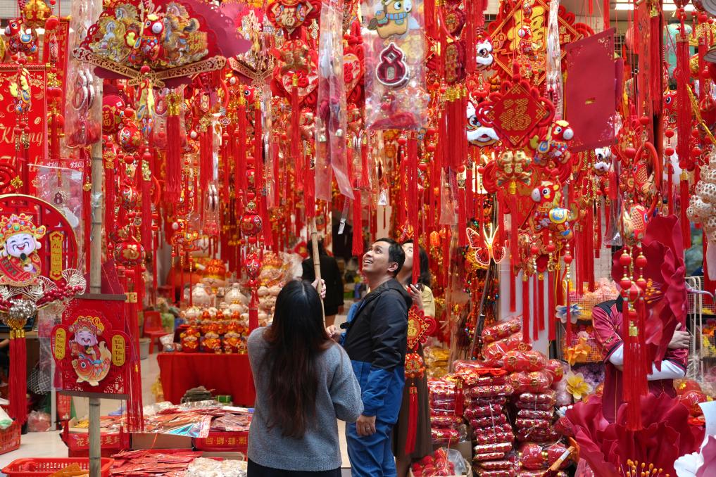 2月13日,顾客在越南首都河内的马市街选购新春饰品。新华社记者 刘颍 摄
