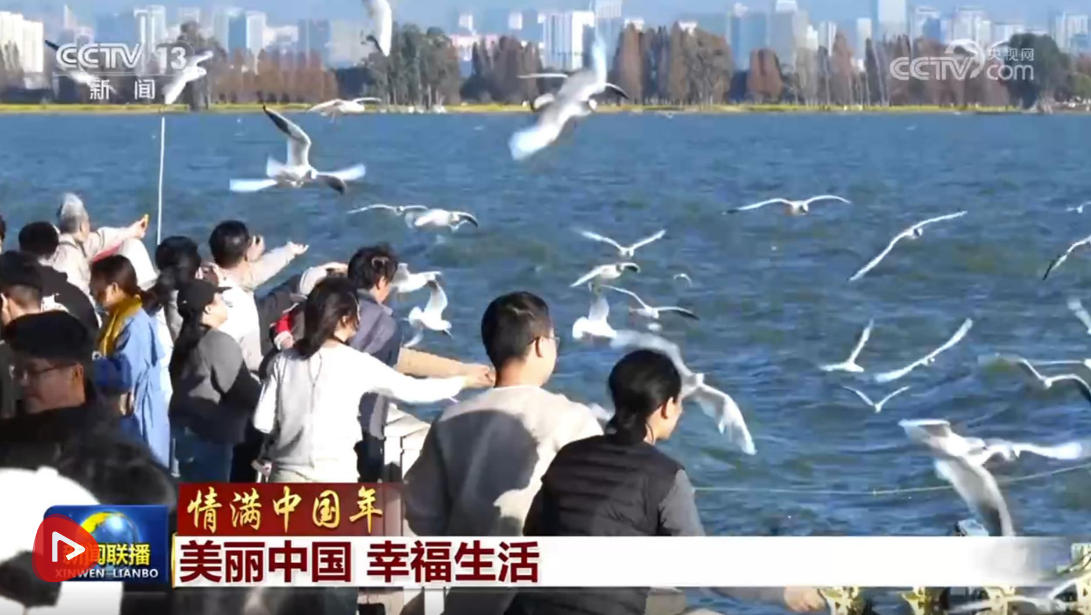 春节假期,云南昆明滇池沙鸥翔集、碧波荡漾,在紧邻滇池的福保社区,人们跳起民族舞蹈,喜迎八方来客,共赏滇池生态美景。