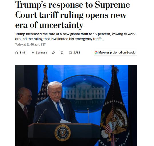 中新网2月22日电 当地时间2月21日,美国《华盛顿邮报》发文称,美最高法院近日裁决美政府紧急关税政策无效,这结束了一个“经济不确定性的篇章”,同时也开启了“另一个不确定性的篇章”。