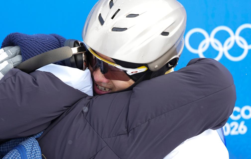 2月20日,王心迪(右)和妻子徐梦桃在比赛中拥抱。当地时间2月20日,在意大利利维尼奥举行的米兰-科尔蒂纳冬奥会自由式滑雪男子空中技巧决赛中,中国选手王心迪和李天马分获冠军和季军。新华社记者 邬惠我 摄