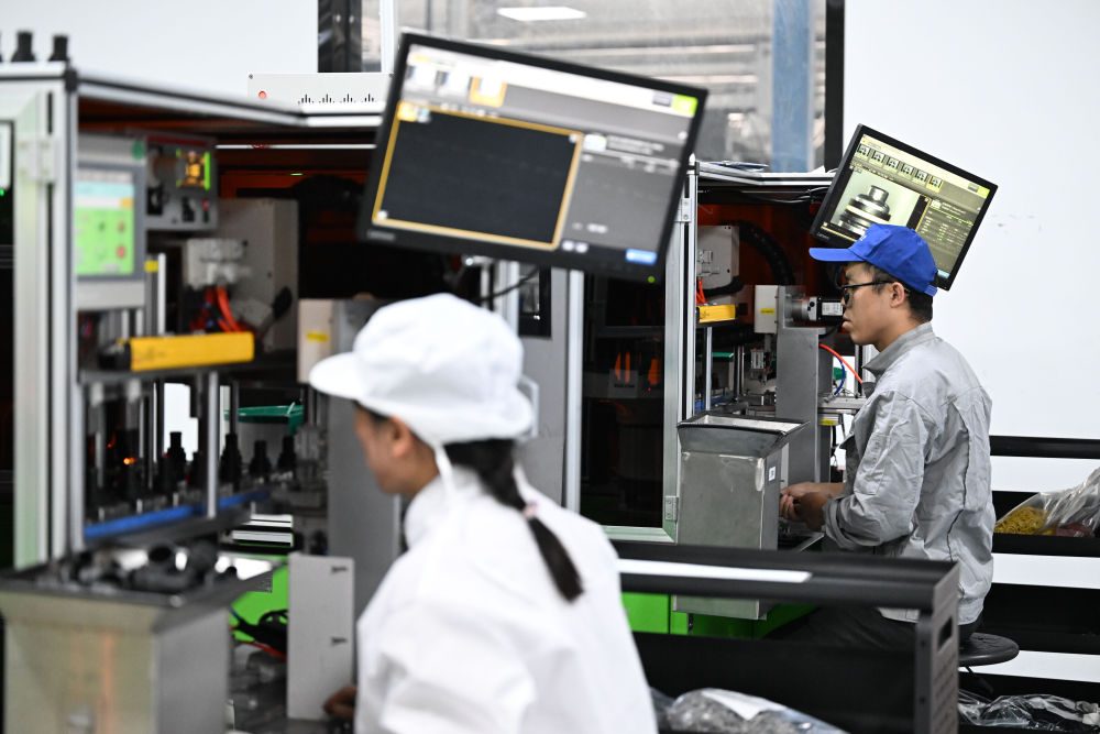 工作人员在天津鹏翎集团股份有限公司生产车间操作半自动生产设备生产汽车胶管接头。新华社记者 赵子硕 摄