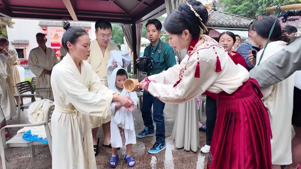在福州源脉温泉园,一场颇具福州特色的新春“洗头汤”祈福仪式举行。