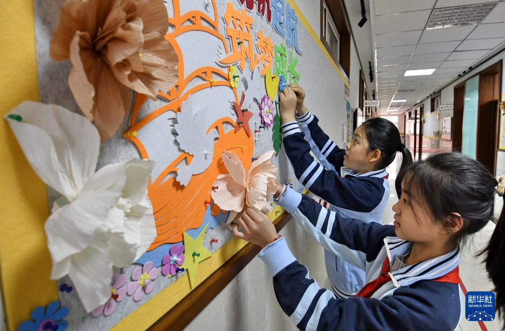 3月2日,北京黑芝麻胡同小学学生在布置假期活动展示板。