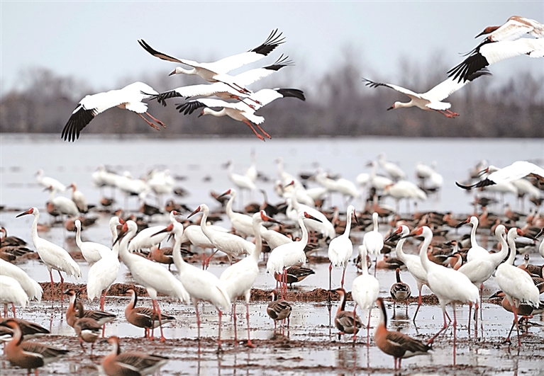 上千只白鹤齐聚江西省上饶市余干县白鹤洲栖息觅食。新华社发