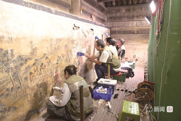2025年6月,陕西省文物保护研究院(陕西省文物鉴定研究中心)工作人员修复留坝三圣宫壁画。受访者供图