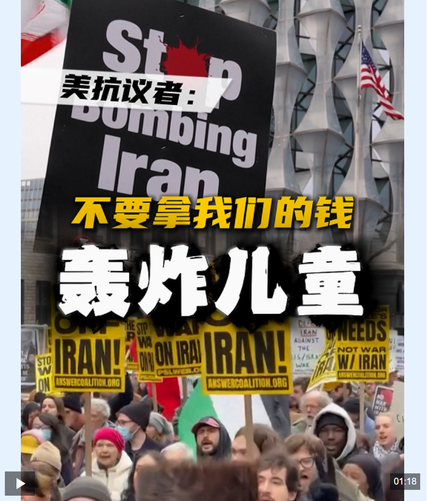 在美国,抗议者手举“不要插手伊朗”的标语,希望所有国家和国际组织施压美国和以色列,要求他们停止战争,不要轰炸儿童。英国反战人士表示,世界政治正面临着最危险的时刻,美以的袭击不仅在伊朗国内造成杀戮,还引发了更大规模的中东战争,让人恐惧和愤怒。加拿大抗议者表示,他们不接受以色列和美国在伊朗所作的一切。