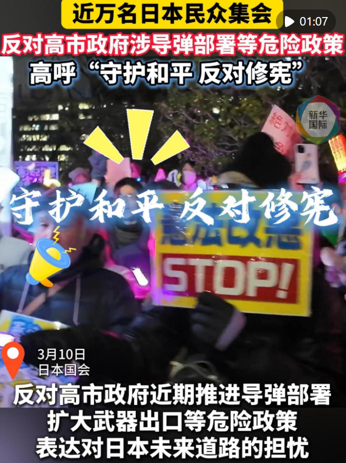 近期,高市政府除着手修改“防卫装备转移三原则”运用指南、为武器出口进一步“松绑”外,还加快推进在日本境内部署远程导弹,并试图推动修宪,在日本社会各界引发广泛担忧与批评。(记者:李子越、李林欣;视频:操兰漪)