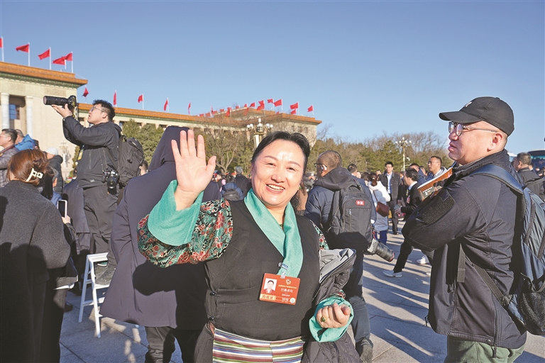 图为住藏全国政协委员巴桑卓玛向记者挥手致意。记者 陶玥 摄