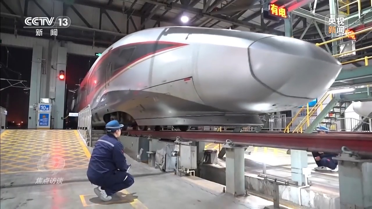 深夜时分,从广州南站开来的G424次列车缓缓进入检修库。这是一列16节编组的复兴号智能动车组,头一天它从郑州东站出发前往广州南站,又从广州南站到北京西站,稍作停留后,第二天又开回广州南站,最后返回郑州东站。相当于两天的时间,就在大半个中国跑了一个来回。