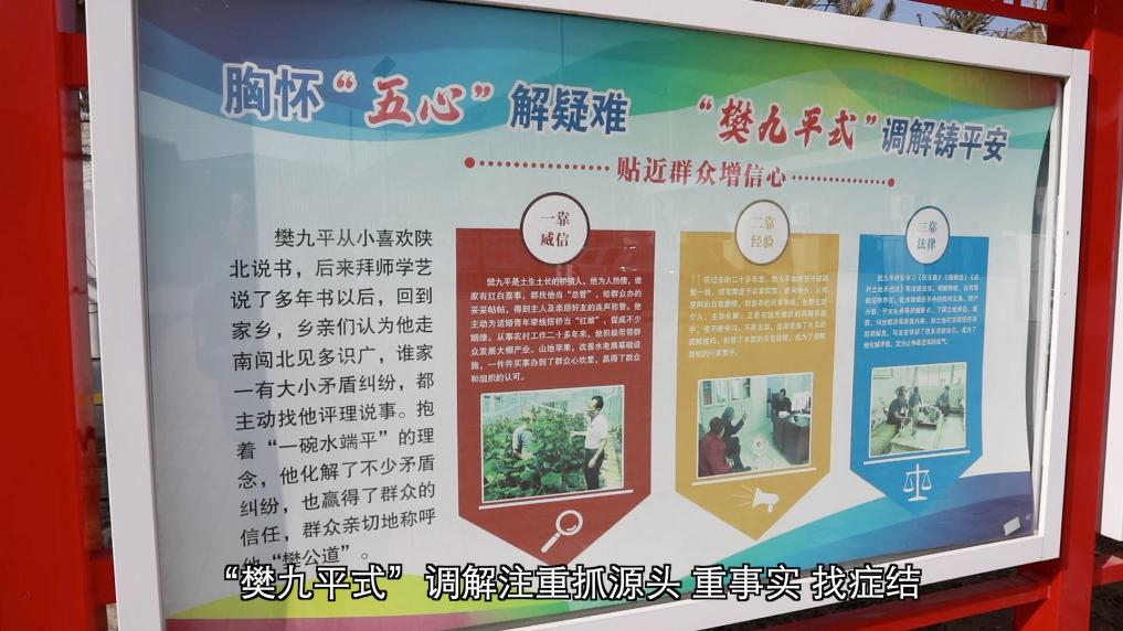 在陕西省延安市甘泉县桥镇乡桥镇村,村党支部书记樊九平扎根基层二十多年,他将多年经验总结为“五心”和“十法”,以信心、耐心、公心、细心、初心对待每一起纠纷,灵活运用政策引导、换位思考、亲情感化等十种群众易于接受的方法,成功调解各类矛盾两千余起。
