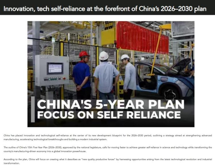 文章认为,中国已将创新和科技自立自强置于“十五五”规划新发展蓝图的核心位置。该蓝图阐述了一系列旨在强化高端制造业、加速技术突破以及构建现代化产业体系的战略方针。根据该规划,中国将聚焦于通过把握最新技术革命和产业变革所带来的机遇,发展新质生产力。