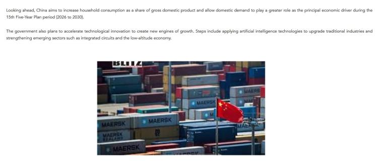 文章注意到,中国计划在“十五五”期间提高居民消费占国内生产总值的比重,让内需在拉动经济增长中发挥更主要的作用。此外,政府还计划通过加快科技创新打造经济增长新引擎,具体措施包括应用人工智能技术赋能传统产业转型升级,以及做大做强集成电路、低空经济等新兴产业。