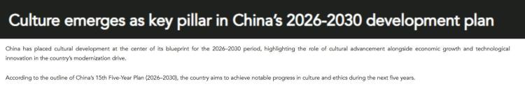 文章说,在推进中国式现代化的进程中,文化建设与经济发展、科技创新同等重要。“十五五”规划纲要在提出加强文化自信、优化公共文化服务供给、促进文化产业发展等方面作出明确要求。