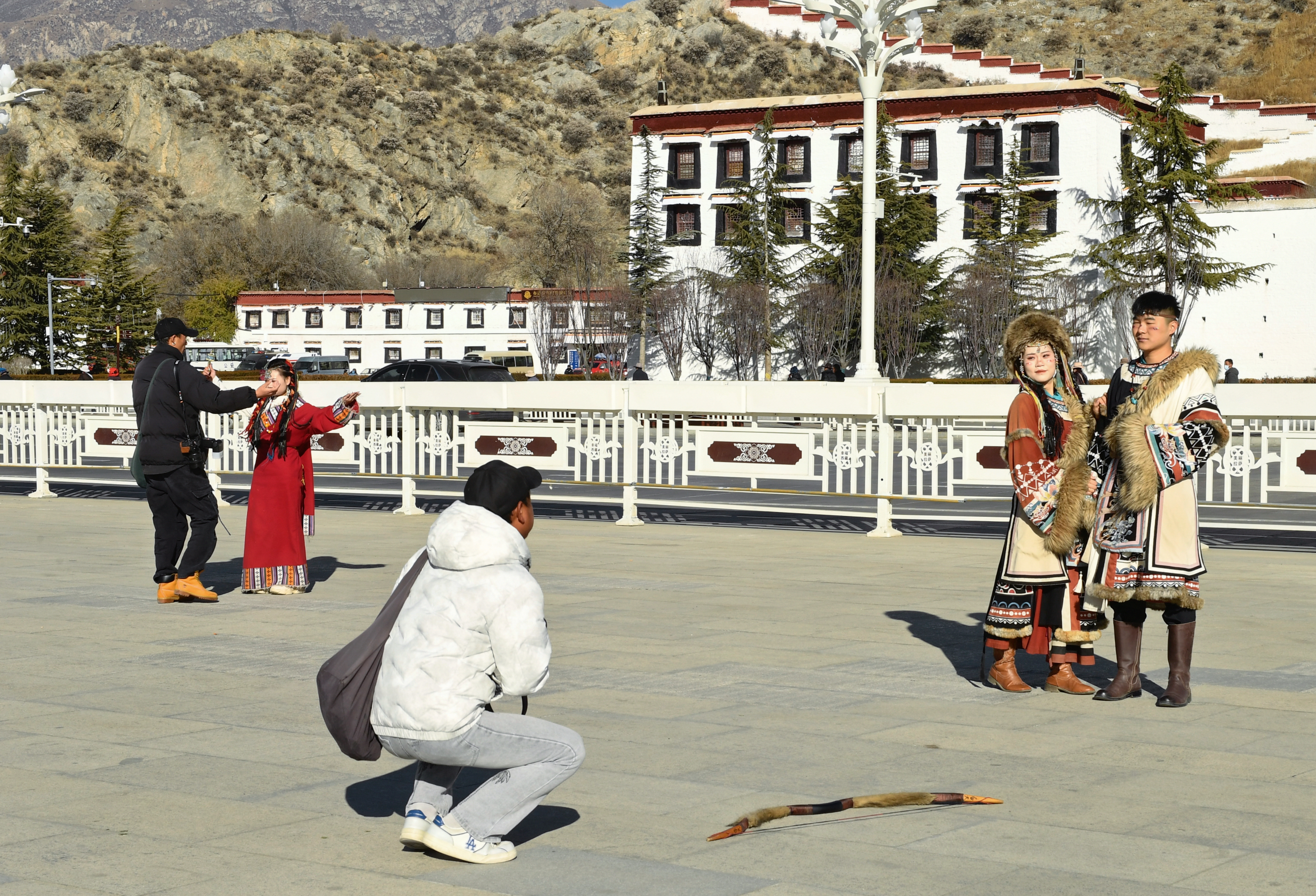 图为游客穿着藏装在布达拉宫广场拍摄写真照。记者 旦增兰泽 摄
