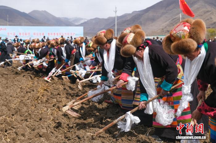 3月16日,拉萨市曲水县达嘎镇色达村村民参加春耕仪式。中新社记者 江飞波 摄