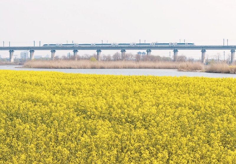 “十五五”的第一个春天,一列高铁列车穿行在合肥十八联圩生态湿地。 新华社图