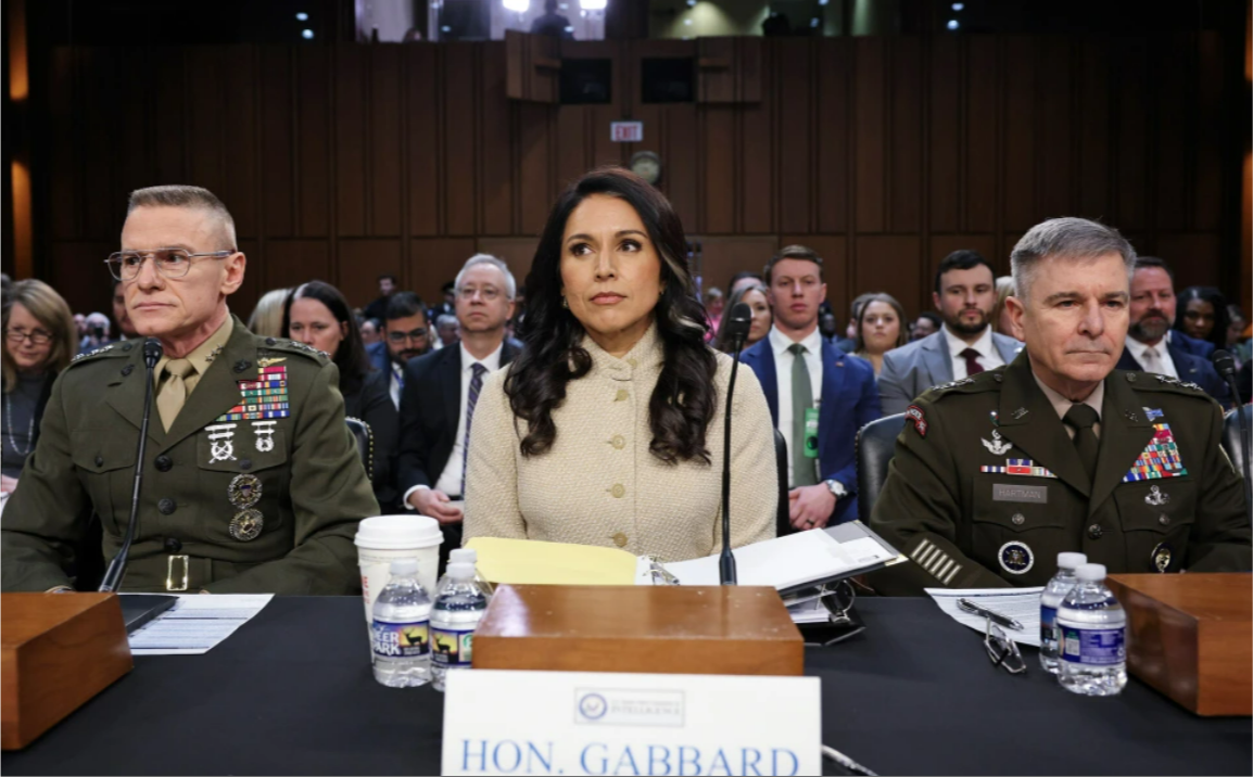 加巴德3月18日出席国会参议院情报特别委员会就美国所面临“全球安全威胁”举行的年度听证会 图源:美国全国广播公司(NBC)报道截图