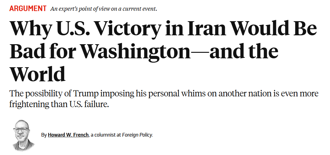 弗伦奇直言,问题不只是美国“能不能赢”,更在于本届美国政府始终没有给出一个连贯、清晰的胜利定义。作者表示,支持这场战争意味着认同一种盲目且不加思考的美国权力观——一种“强权即公理”的观念,并纵容华盛顿的所作所为,而这种行为完全脱离道义和伦理约束。