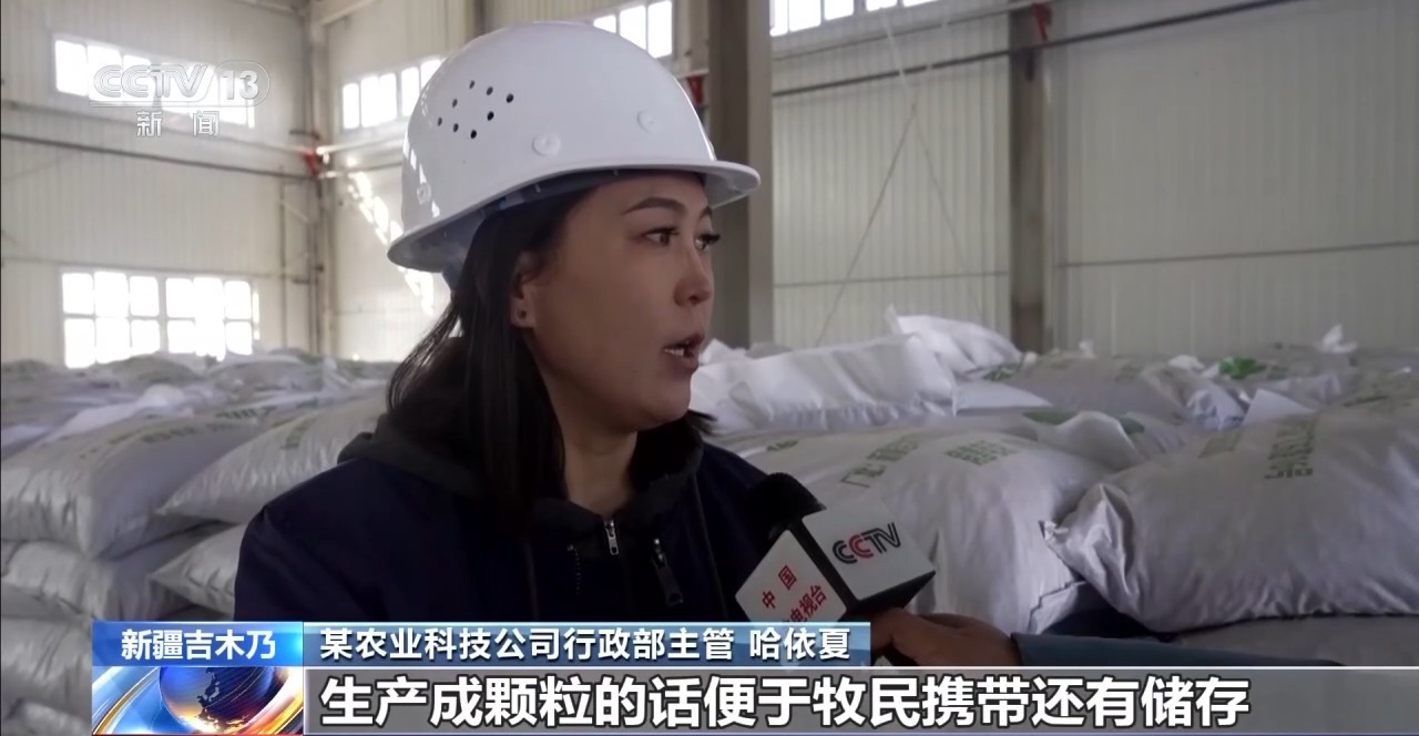 某农业科技公司行政部主管 哈依夏:生产成颗粒,便于牧民携带和储存,除了新疆以外,还有往河北、内蒙古、甘肃等地方销售。