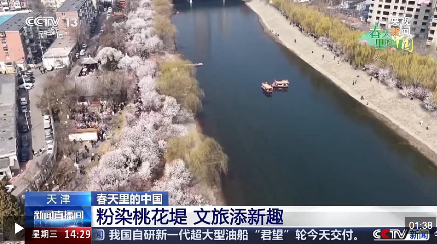 眼下,在天津市红桥区的北运河两岸,全长1.3公里的桃花堤已成为花的海洋,吸引市民游客前来踏青赏花。