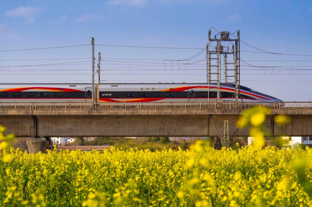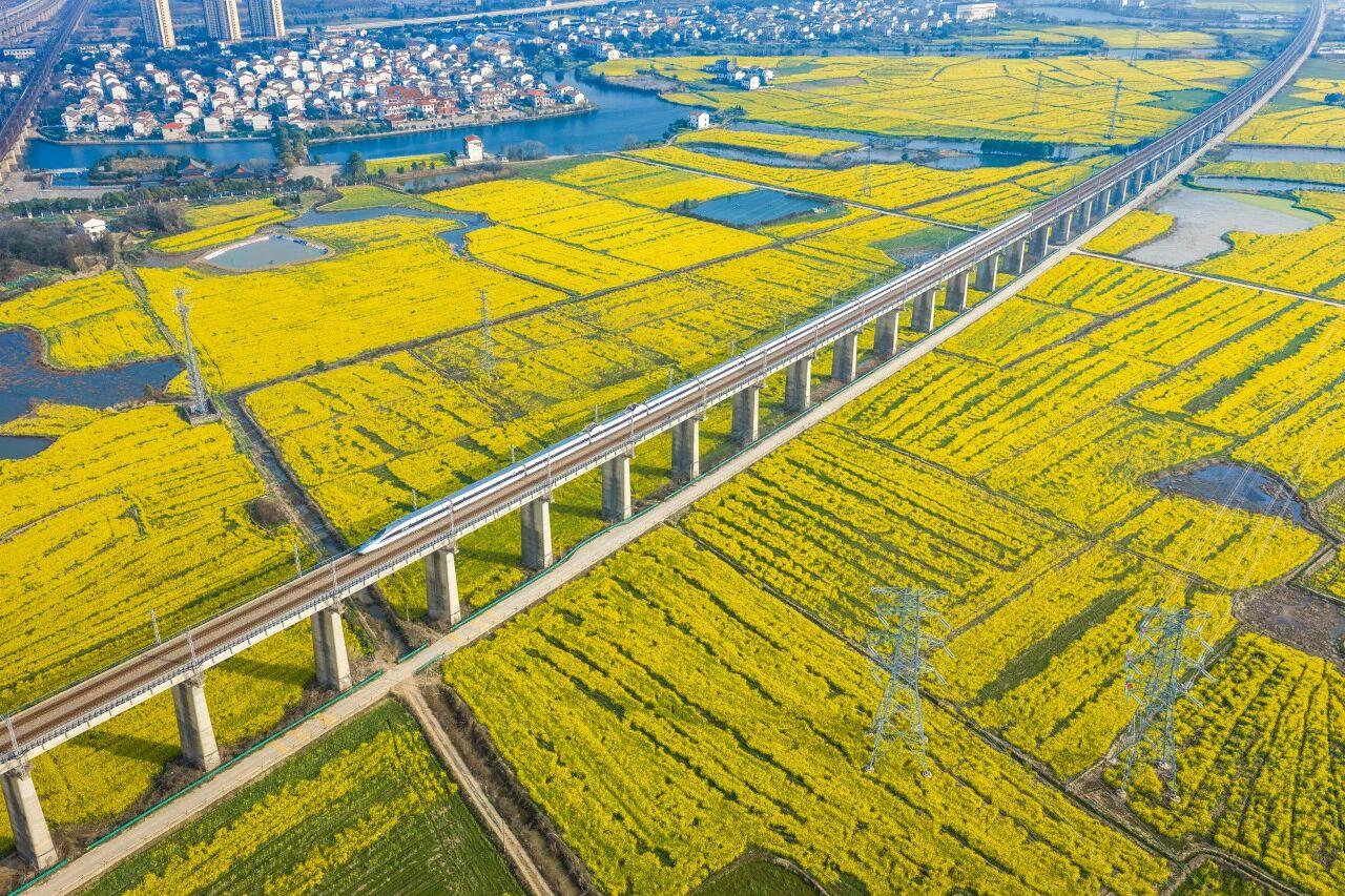 △南昌东站附近,复兴号行驶在油菜花海中。