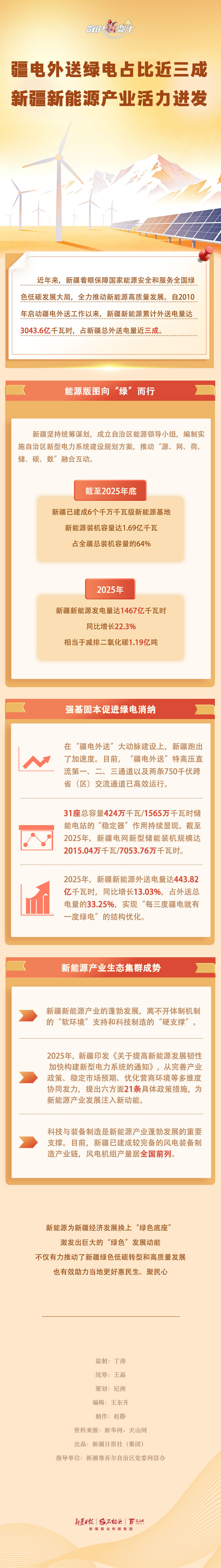 最新数据显示,自2010年启动疆电外送工作以来,新疆新能源累计外送电量达3043.6亿千瓦时,占新疆总外送电量近三成。新疆清洁能源基地建设得怎么样?有哪些亮点?今天的《数说“新”变化》一起来看看。