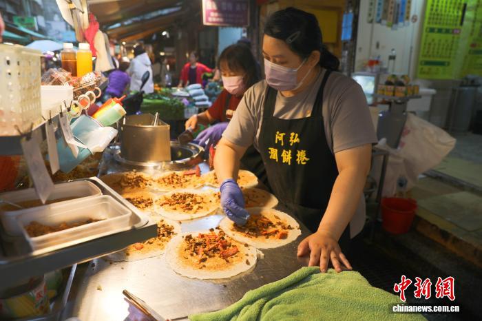 4月1日,台北吴兴街市场内,“阿弘润饼卷”店的工作人员将炒好的馅料铺在饼皮上。中新社记者 刘大炜 摄