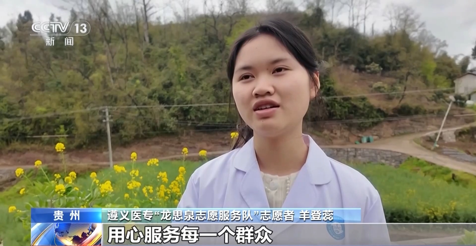 遵义医专“龙思泉志愿服务队”志愿者羊登蕊:我们志愿服务队的志愿者都是以龙思泉烈士为标杆,传承红色精神,发挥医学专业优势,用心服务每一名群众,用自己的青春行动来践行医者担当。