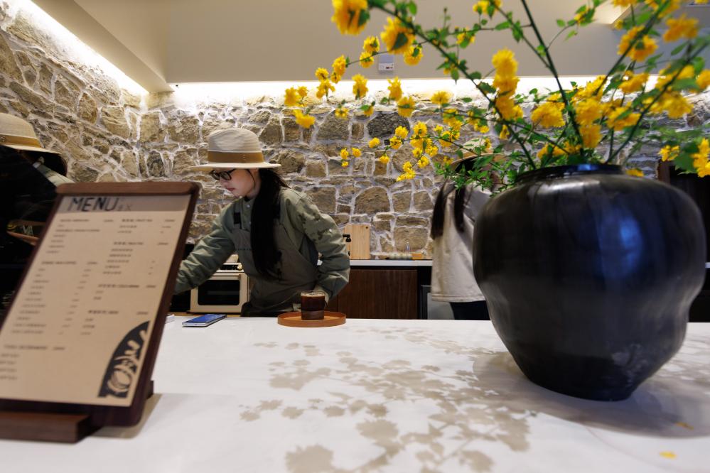 4月2日,贵州省毕节市百里杜鹃管理区普底乡迎丰村特色民宿内,工作人员在制作咖啡。新华社记者 刘续 摄