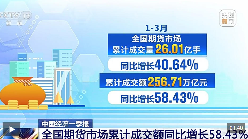 数据显示,1-3月全国期货市场累计成交量为26.01亿手,累计成交额为256.71万亿元,同比分别增长40.64%和58.43%。