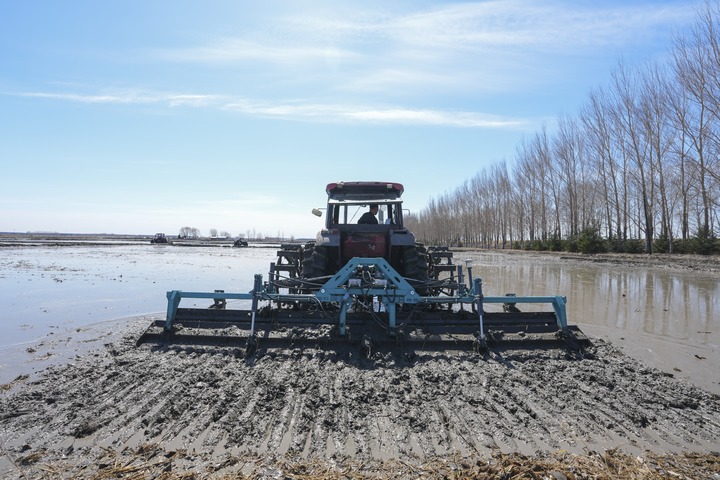 这是4月9日拍摄的黑龙江北大荒农业股份有限公司友谊分公司水稻田整地作业现场(无人机照片)。新华社记者王松 摄